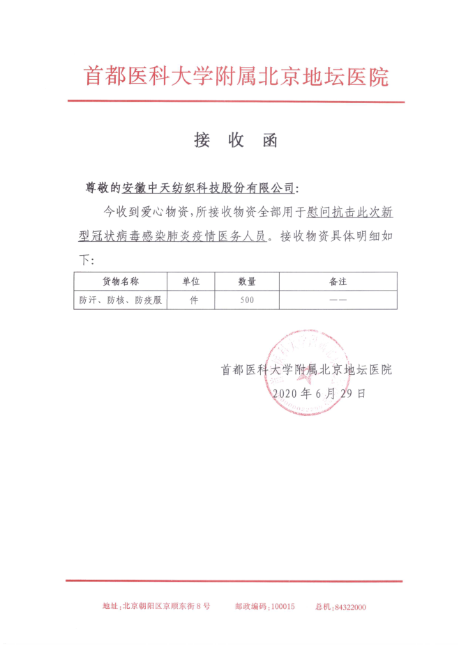 自6月11日,北京突發疫情反彈進入防疫戰時狀態后,安徽中天紡織科技股份有限公司向首都醫科大學附屬北京地壇醫院捐贈了500件防汗、防核、防疫服,用于慰問抗擊此次新型冠狀病毒肺炎疫情的醫務人員。首都醫科大學附屬北京地壇醫院作為北京目前獨家承擔收治任務的醫院,各部門有序應對,再一次體現了地壇速度。 近日,安徽中天紡織科技股份有限公司收到了來自首都醫科大學附屬北京地壇醫院的感謝信,向我們表達了衷心的感謝,他們表示只要萬眾一心,堅定信心,科學防疫,我們一定能打贏這場疫情防治阻擊戰。 安徽中天紡織科技股份有限公司認為,能夠為這次北京市疫情防控做點貢獻是我們應盡的責任,當前新型冠狀病毒感染的肺炎疫情防控工作仍處于關鍵時期,疫情防控關乎每名職工的生命健康,為推進疫情防控工作有序開展,安徽中天紡織科技股份有限公司號召公司全體員工堅定信心、同舟共濟,齊心協力做好疫情防控工作,堅決遏制疫情蔓延勢頭,為維護大局穩定做出自己的貢獻。