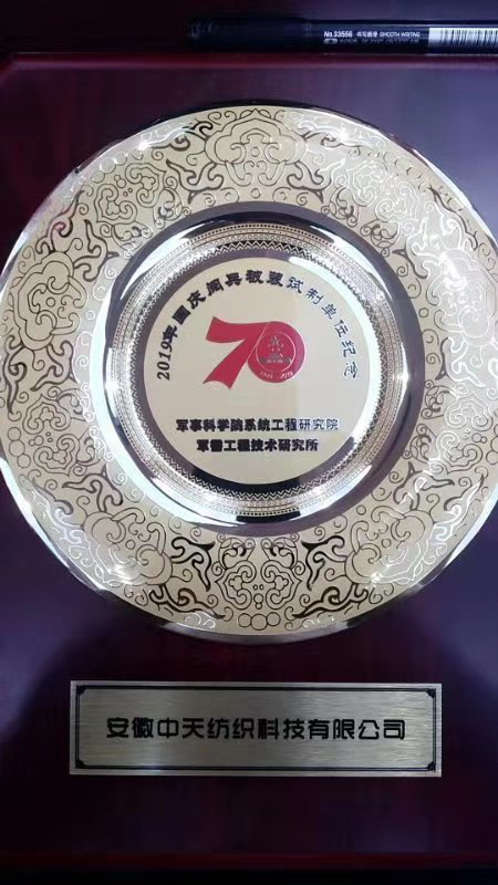 對安徽中天紡織科技股份有限公司新型迷彩材料的高標準高質量保障給予高度評價。會議授予各企業紀念牌,以示表彰。