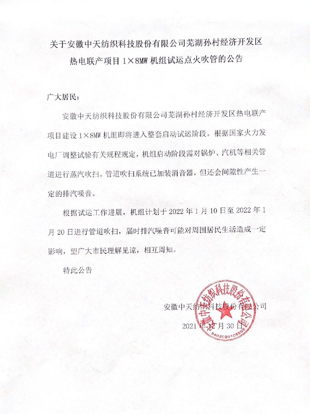 蕪湖孫村經濟開發區熱電聯產項目1X8MW機組試運點火吹管公告